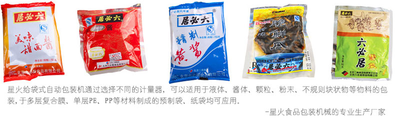 六必居的醬菜所以出名,與它選料精細、制作嚴格分不開。六必居醬菜的原料,都有固定的產地。六必居有十二種傳統產品,它們是:甜醬黑菜、甜醬八寶菜、甜醬八寶瓜、甜醬黃瓜、甜醬甜露、甜醬姜芽、甜醬什香菜、甜醬小醬蘿卜、甜醬瓜、白糖蒜、稀黃醬、鋪淋醬油。這些產品色澤鮮亮,醬味濃郁,脆嫩清香,咸甜適度。現在,不少傳統名牌醬菜,還制成罐頭,遠銷國外。六必居也是星火北京食品包裝機械的主要客戶之一,給袋式自動包裝機用于干黃醬、甜面醬、麻辣花生、特味脆鮮瓜、雪菜的包裝。包裝產品如下圖: