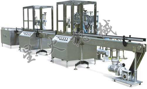 | 旋轉式灌裝機技術參數: 灌裝閥個數:12個 灌裝容量:0.1-2L 灌裝精度:±1% 灌裝物粘度:7-370 cp(50℃) 壓縮空氣壓力:0.4-0.6MPa 壓縮空氣消耗量:0.1M/3M 較大生產功率:3000瓶/時 (100ml) 主傳動電機功率:2.2kw(3相 380V 50Hz) 外形尺寸:2100×2370×2700 mm (長×寬×高) 重量:2000 kg | 自動旋蓋機(配振盤式送蓋機,不同規格瓶蓋需更換振盤)技術參數: 適用瓶身直徑:50-90mm 適用瓶蓋直徑:18-50mm 驅動電機:370W 輸送速度:5-15米/分鐘 輸送帶寬度:82毫米 輸送帶:賽鋼鏈片式 生產能力:>3000瓶/分鐘 額定電壓:220V/50Hz 整機功率:800W 輸送帶離地高度:750毫米±20毫米 | 立式貼標機技術參數: 額定電壓:220V/50Hz 整機功率:1000W 外型尺寸:1700×1100×1300 mm 整機重量:200Kg 適用產品范圍:外徑20-90mm,高度50-230mm 適用標簽范圍:高15-100mm, 長 20-300 mm 生產能力:>3000瓶/小時(包括貼標和噴碼) |